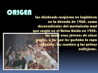 Los skinheads surgieron en la década de 1960 en Inglaterra como descendientes de los mods, jóvenes de clase media que les gustaba la moda elegante, las scooters y las peleas callejeras. Más tarde, algunos skinheads adoptaron ideologías de extrema derecha como el neonazismo y el fascismo, mientras que otros abrazaron el anarquismo, el socialismo o el comunismo. Existen también skinheads que se apegan a la cultura original centrada en la música ska, Oi! y reggae.
