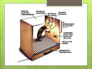 B.F. Skinner fue un psicólogo estadounidense conocido por desarrollar el conductismo radical y el condicionamiento operante. Realizó experimentos clásicos con palomas en cajas de condicionamiento para demostrar que los refuerzos condicionan la conducta, incluso cuando no son contingentes a una respuesta. También diseñó las cajas de Skinner, que registran las respuestas operantes de los animales sujetos a estímulos y refuerzos. A lo largo de su carrera, aplicó sus principios conductistas a campos como la educ