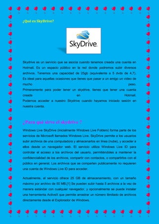 SkyDrive y Dropbox son servicios de almacenamiento en la nube que permiten a los usuarios acceder y compartir archivos desde cualquier dispositivo. SkyDrive es un servicio asociado a cuentas de Hotmail que ofrece 25GB de almacenamiento gratuito, mientras que Dropbox permite sincronizar archivos entre dispositivos a través de una carpeta compartida y ofrece copias de seguridad de archivos. Ambos servicios pueden usarse para compartir archivos grandes, acceder a archivos desde diferentes lugares, y almacenar archivos de manera segura en la n