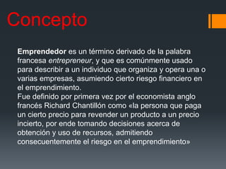 El documento define el término "emprendedor" como un individuo que organiza y opera una o más empresas asumiendo cierto riesgo financiero. Fue definido por primera vez por el economista Richard Cantillon como alguien que compra un producto a un precio incierto para revenderlo a un precio también incierto. La importancia del emprendimiento ha crecido debido a altos niveles de desempleo y baja calidad de empleos existentes, lo que ha llevado a las personas a generar sus propios recursos e iniciar sus propios negocios.