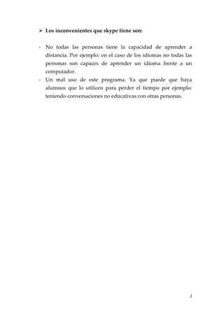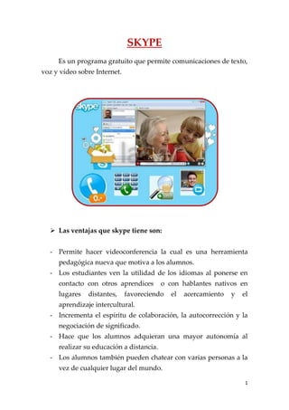 Skype es un programa gratuito que permite comunicaciones de texto, voz y video a través de Internet, lo que facilita la videoconferencia entre estudiantes y maestros de diferentes lugares para mejorar el aprendizaje de idiomas de una manera más interactiva y colaborativa, aunque requiere que los estudiantes sean autodidactas y lo usen responsablemente solo para fines educativos.