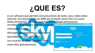 Skype es un software gratuito que permite realizar llamadas de voz y videochat entre usuarios a través de Internet. Fue desarrollado en 2003 y actualmente cuenta con más de 170 millones de usuarios a nivel mundial. Skype ofrece comunicación gratuita entre sus usuarios, así como llamadas de bajo costo a teléfonos fijos y móviles. Es compatible con diversos sistemas operativos como Windows, Mac OS, Android e iOS.