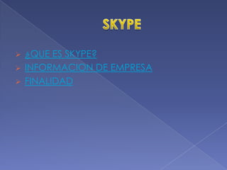 Skype es un software gratuito desarrollado en 2003 que permite realizar llamadas de voz y video sobre Internet entre usuarios de Skype de forma gratuita, así como llamar a teléfonos fijos y móviles a bajas tarifas. Fue adquirido por eBay en 2005 y posteriormente por Microsoft en 2011. Su objetivo principal es conectar a los usuarios a través de mensajería instantánea, voz y video de manera gratuita o a bajo costo entre computadoras y redes telefónicas.