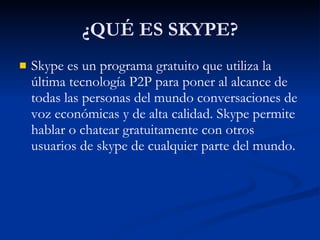 Skype es un programa gratuito que usa tecnología P2P para proporcionar llamadas de voz de alta calidad y bajo costo entre usuarios de Skype en todo el mundo. Los usuarios pueden buscar y agregar nuevos contactos, chatear con múltiples personas simultáneamente, realizar llamadas de voz uno a uno o en conferencia con varios participantes. Skype requiere un PC con Windows, procesador, RAM y espacio en disco duro, así como micrófono y bocinas para descargar, instalar y usar el programa.