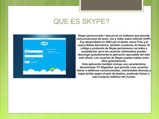 Skype es un software gratuito desarrollado en 2003 que permite comunicaciones de voz, texto y video a través de Internet entre usuarios de Skype de forma gratuita. También ofrece la función SkypeOut para que los usuarios puedan realizar llamadas a teléfonos fijos y móviles a bajas tarifas según el país de destino. Skype es una herramienta web 2.0 que sirve para comunicarse con otras personas a través de video llamadas y chat sin necesidad de reunirse físicamente y puede usarse con fines educativos para exponer