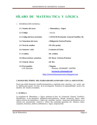 Este documento presenta la matriz y el sílabo de un curso de Matemática y Lógica. El objetivo general es conocer tópicos de matemática y lógica que permitan resolver situaciones problemáticas de manera creativa y crítica. Los contenidos incluyen lógica proposicional, conjuntos, números reales, funciones y análisis combinatorio. El curso se evalúa mediante actividades problemáticas y exámenes parciales por unidad.