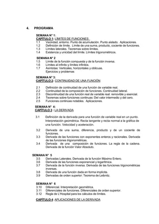 Este documento presenta el sílabo del curso de Cálculo Diferencial impartido en la Universidad Nacional de Ingeniería. El curso dura 17 semanas y cubre temas como límites, derivadas, secciones cónicas, ecuaciones paramétricas y polares. Los estudiantes aprenderán a aplicar los conceptos de cálculo para resolver problemas de ingeniería. El curso se evaluará mediante prácticas calificadas, exámenes parcial y final.