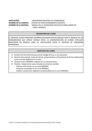 Este documento presenta el sílabo de un curso sobre el manejo de la tecnología educativa para cursos en línea y Moodle. El curso se llevará a cabo en la Universidad Nacional de Chimborazo y busca desarrollar competencias básicas en el uso de herramientas como Google Drive y en la administración de cursos virtuales en Moodle para mejorar los procesos de enseñanza-aprendizaje. El curso consta de cuatro unidades que cubren el uso de estas herramientas educativas y la implementación de aulas