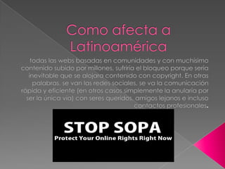 La Ley SOPA (Stop Online Piracy Act) es un proyecto de ley estadounidense de 2011 que busca combatir la piratería en internet mediante el bloqueo de sitios web y servicios acusados de infringir derechos de autor, así como la congelación de fondos y publicidad asociados. De aprobarse, la ley podría restringir la libertad de prensa al censurar enlaces e información en medios de comunicación.