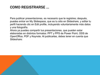 Slideshare es un sitio web que permite a los usuarios subir presentaciones en formato PowerPoint u OpenOffice para compartirlas en línea de manera gratuita. Los usuarios pueden crear una cuenta en Slideshare para editar su perfil y administrar las presentaciones subidas. Una vez subida la presentación, Slideshare la convierte a formato Flash para que pueda ser vista en línea sin animaciones ni transiciones entre diapositivas.