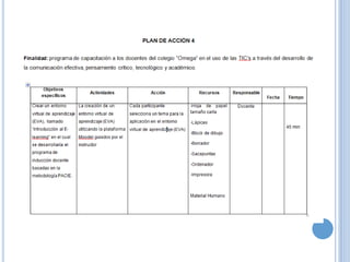El documento presenta el plan de capacitación tecnológica para el Colegio Omega en Nicaragua por parte del equipo de asesores @sesores.edu. El equipo cuenta con recursos técnicos, económicos, institucionales y sociales para implementar el proyecto de forma virtual. El enfoque de aprendizaje será por indagación siguiendo el ciclo de preguntar, investigar, crear, discutir y reflexionar en grupos sobre temas definidos.