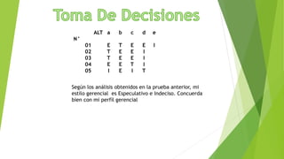 Este documento presenta los resultados de varias pruebas y evaluaciones realizadas a Anaiseth Quevedo para analizar su estilo y habilidades gerenciales. Los análisis muestran que su estilo es especulativo e indeciso, y que tiene buen control de emociones pero una actitud dilatoria. También destaca su capacidad para colaborar y competir de manera eficiente.