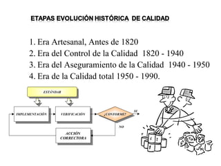 El documento describe las cuatro eras de la calidad desde 1820 hasta 1990, incluyendo la era artesanal, la era del control de calidad, la era del aseguramiento de calidad y la era de la calidad total. También describe ocho principios de calidad como enfoque al cliente, liderazgo, participación del personal, enfoque al proceso, mejora continua, toma de decisiones basada en hechos y relación mutuamente beneficiosa con proveedores.