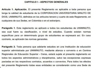 La misión de la Universidad Uniminuto es ofrecer educación superior de alta calidad y fácil acceso para formar profesionales competentes y éticos que contribuyan a la transformación social y la paz en el país. Su visión es que para el 2012 sea reconocida por su aporte educativo al desarrollo nacional, la calidad de sus programas y su impacto en la cobertura a través de múltiples sedes. El reglamento establece que los estudiantes pierden una asignatura si faltan a más del 15% de las clases