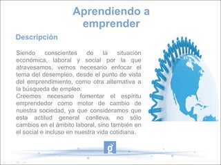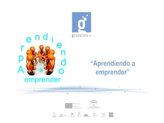 Este documento describe un proyecto llamado "Aprendiendo a emprender" que tiene como misión fomentar la cultura emprendedora entre los jóvenes. El proyecto busca ofrecer recursos y herramientas básicas para iniciar un emprendimiento a través de actividades que aumenten la actitud emprendedora. El proyecto se desarrollará en tres fases a lo largo de 2012 en centros de tres municipios, con el objetivo de promover una actitud favorable hacia el emprendimiento y potenciar la actividad económica local y redu