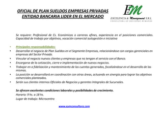 El documento anuncia una posición de Oficial de Plan Sueldos para Empresas Privadas en una importante entidad bancaria. El rol implica desarrollar el negocio de planes de sueldos para empresas, atraer nuevos clientes empresariales, cotizar y cerrar nuevos negocios, y fidelizar cuentas existentes trabajando en coordinación con otras áreas del banco. Se requiere experiencia en posiciones comerciales y capacidad de trabajo autogestionado.