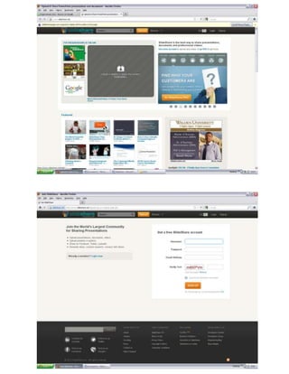 SlideShare es un sitio web gratuito donde los usuarios pueden subir presentaciones en formatos como PowerPoint y PDF para compartirlas públicamente en línea en formato Flash, permitiendo verlas y añadir comentarios, con hasta 20 MB de tamaño por archivo. Fue lanzado en 2006 y recibe alrededor de 12 millones de visitas mensuales, funcionando de manera similar a YouTube pero centrado en presentaciones.