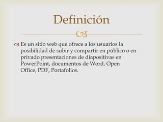 SlideShare es un sitio web que permite a los usuarios subir y compartir presentaciones de PowerPoint, documentos de Word u otros formatos de manera pública o privada. Ofrece la ventaja de compartir diapositivas de forma más fácil entre personas con acceso a ellas y puede usarse como herramienta para la enseñanza en línea. Aunque es sencillo de usar, tiene limitaciones como que las presentaciones son estáticas y no admiten animaciones ni sonido.