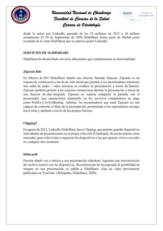 SlideShare es un sitio web lanzado en 2006 para compartir presentaciones. Fue adquirido por LinkedIn en 2012 y renombrado como LinkedIn SlideShare. Ofrece a los usuarios subir y compartir documentos en formatos como PDF y presentarlos de forma pública o privada. También proporciona servicios como Zipcasts para transmitir presentaciones en vivo y Clipping para guardar diapositivas individuales. SlideShare sirve para compartir contenido corporativo, mostrar productos de forma visual, compartir contenido dinámico con seguidores y mejorar el posicionamiento SEO.