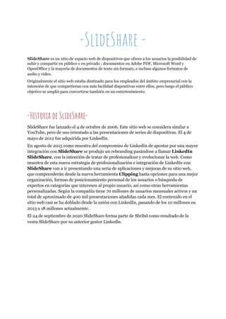 SlideShare es un sitio web que permite a los usuarios subir y compartir documentos como presentaciones de PowerPoint, PDF y Word. Originalmente fue creado en 2006 para que los empleados compartieran diapositivas, pero luego se amplió para el público general. En 2012 fue adquirido por LinkedIn y en 2020 pasó a formar parte de Scribd.