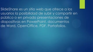 SlideShare es un sitio web que permite a los usuarios subir y compartir presentaciones, documentos y otros archivos. Los usuarios pueden evaluar, comentar y compartir el contenido subido. Fue adquirido por LinkedIn en 2012 y recibe alrededor de 12 millones de visitas al mes, siendo similar a YouTube pero centrado en presentaciones.