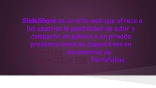 SlideShare es un sitio web que permite a los usuarios subir y compartir presentaciones de diapositivas, documentos y otros archivos. Los usuarios pueden evaluar, comentar y compartir el contenido subido. SlideShare fue adquirido por LinkedIn en 2012 y permite a los usuarios transmitir presentaciones en vivo con audio y video a través de su función Zipcasts.