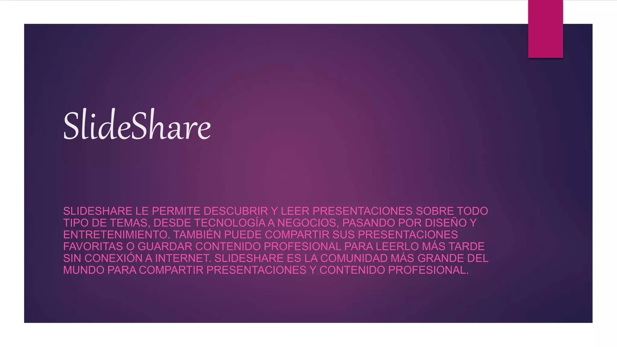 SlideShare permite a los usuarios descubrir y leer presentaciones sobre una variedad de temas, así como compartir sus propias presentaciones favoritas o guardar contenido profesional para leerlo sin conexión a Internet. Fue lanzado en 2006 y actualmente recibe alrededor de 56 millones de visitantes únicos por mes, siendo la comunidad más grande del mundo para compartir presentaciones y contenido profesional.