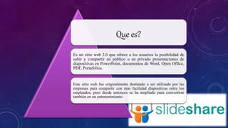 SlideShare es un sitio web que permite a los usuarios subir y compartir presentaciones de diapositivas, documentos y otros archivos. Originalmente destinado a compartir presentaciones entre empresas, ahora también se usa para entretenimiento. Fue lanzado en 2006 y adquirido por LinkedIn en 2012 para ampliar su enfoque en contenido profesional. El contenido en el sitio se ha duplicado desde la adquisición.