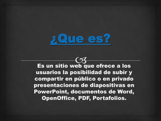 SlideShare es un sitio web que permite a los usuarios subir y compartir presentaciones de diapositivas, documentos y otros archivos de forma pública o privada. Inicialmente fue creado para que las empresas compartieran presentaciones de forma más fácil entre empleados, pero ahora también se usa para entretenimiento. En 2011 añadió Zipcasts, un sistema de conferencias en línea que permite transmitir presentaciones con audio/video y chat, aunque no admite compartir pantalla como otros servicios de pago.