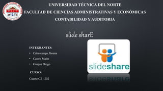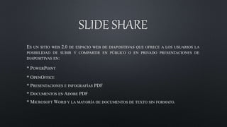 Slideshare es una plataforma web que permite a los usuarios subir y compartir presentaciones en diversos formatos, lanzada en 2006 y adquirida por LinkedIn en 2012. Funciona creando un espacio personal donde se pueden subir archivos de hasta 100 MB, y ofrece características como comentarios y búsqueda de presentaciones. A pesar de sus ventajas, como la facilidad de compartir presentaciones, tiene desventajas como limitaciones en formato y la falta de valor sin un presentador.