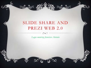 Este documento describe dos herramientas web 2.0 para crear y compartir presentaciones: SlideShare y Prezi. SlideShare permite a los usuarios subir y compartir presentaciones de PowerPoint, Word, PDF u otros formatos de manera pública o privada. Prezi es una aplicación para crear presentaciones de forma dinámica y no lineal, donde el usuario puede navegar libremente entre el contenido en lugar de avanzar diapositiva por diapositiva. Ambas herramientas permiten organizar y compartir información de manera flexible.