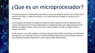 El documento describe lo que es un microprocesador. Un microprocesador es el circuito integrado central más complejo de un sistema informático y se le llama el "cerebro" de una computadora. Ejecuta instrucciones programadas en lenguaje de bajo nivel para realizar operaciones aritméticas y lógicas. Surge de la evolución de las tecnologías de computación y semiconductores en los años 1970 cuando Intel crea el primer microprocesador en un solo chip llamado el 4004.