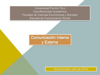 El documento habla sobre la comunicación interna y externa en las organizaciones. Explica que la comunicación interna se dirige a los empleados con el fin de motivarlos y retener talento. También menciona que la comunicación interna contribuye a los objetivos estratégicos de la empresa. Por otro lado, la comunicación externa incluye la proyección de imagen hacia clientes, accionistas y la sociedad para posicionar la marca. Finalmente, resalta que la comunicación interna y externa deben gestionarse de manera coordinada para proyect
