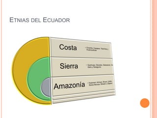 Este documento resume varias tradiciones culturales del Ecuador. Describe celebraciones como el Año Viejo, Carnaval, Día de los Difuntos y Semana Santa, y explica brevemente el significado de cada una. También cubre aspectos religiosos como la predominancia del catolicismo. Finalmente, presenta una lista de platillos típicos de diferentes regiones del país como la costa, sierra y Amazonia.
