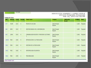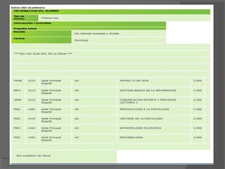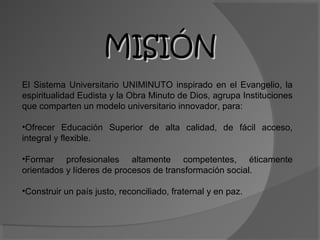 El documento presenta la misión, visión y algunas secciones del reglamento estudiantil de la Universidad UNIMINUTO. La misión se enfoca en ofrecer educación superior de calidad y formar profesionales competentes y líderes de cambio social. La visión destaca ser reconocidos por sus programas académicos, cobertura e impacto nacional e internacional. El reglamento incluye aspectos como inasistencia, donde se pierde la materia si se supera el 15% o 25% de inasistencia.