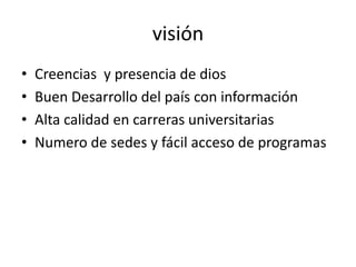 La misión de la universidad es ofrecer una educación de calidad integral inspirada en la espiritualidad de Dios a través de profesionales calificados. Su visión incluye promover las creencias y presencia de Dios, el desarrollo del país mediante la educación, y ofrecer programas de alta calidad con acceso amplio a través de múltiples sedes.