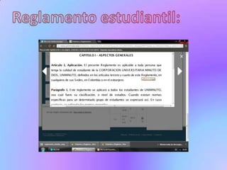Este documento describe el sistema universitario Uniminuto, el cual ofrece educación superior de alta calidad y fácil acceso para formar profesionales competentes y líderes de transformación social. También busca reconocimiento nacional e internacional por su contribución al desarrollo a través de la educación y su impacto en la cobertura debido al número de sedes.