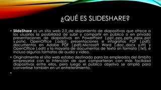 SlideShare es un sitio web que permite a los usuarios subir y compartir presentaciones de diapositivas en formatos como PowerPoint y PDF. Originalmente estaba destinado a empleados para compartir presentaciones fácilmente, pero luego se amplió a más público. Ventajas incluyen poder ver presentaciones desde cualquier PC y enviar archivos grandes. Desventajas son que no admite animaciones ni combinar sonido e imagen. Para crear una cuenta, los usuarios ingresan a la página web, completan un formulario de registro y confirman su correo electrónico.