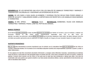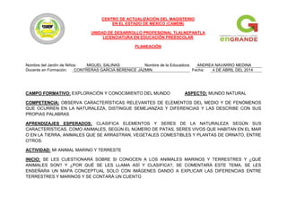 Este documento presenta una planeación para una actividad en el jardín de niños sobre animales marinos y terrestres. La actividad consiste en que los niños observarán y clasificarán imágenes de animales según si viven en la tierra o el mar, colorearán las imágenes y armarán caras de gatos con frutas secas para hablar sobre la importancia de respetar a todos los animales. El objetivo es que los niños aprendan a clasificar elementos de la naturaleza según sus características.