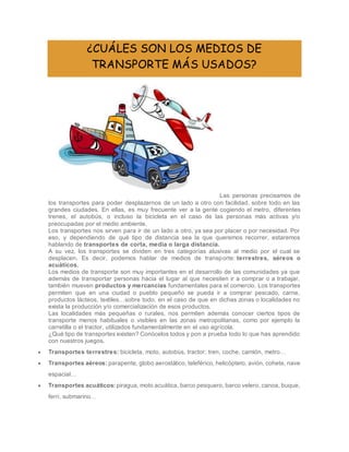 Los medios de transporte más usados en las grandes ciudades son el metro, diferentes trenes, el autobús y la bicicleta. Los transportes nos permiten desplazarnos de un lugar a otro ya sea por placer o necesidad, y se dividen en terrestres, aéreos y acuáticos. Además de transportar personas, los medios de transporte mueven productos y mercancías que son fundamentales para el comercio y desarrollo de las comunidades.