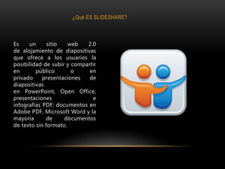 SlideShare es un sitio web que permite a los usuarios subir y compartir presentaciones de diapositivas en formatos como PowerPoint y PDF. Fue lanzado en 2006 como un recurso similar a YouTube para presentaciones y fue adquirido por LinkedIn en 2012. Ofrece ventajas como ser un buen buscador de contenido, permitir subir presentaciones desde Dropbox, agregar audio, y controlar si las presentaciones se pueden descargar.