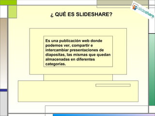 SlideShare es una plataforma para crear y compartir presentaciones en línea. Los usuarios pueden subir archivos de PowerPoint u otros formatos, convertirlos a Flash y publicarlos con una URL para que otros puedan verlos fácilmente en la web. SlideShare ofrece ventajas como compartir presentaciones sin adjuntos pesados de correo y publicar contenido en blogs y sitios web a través de código HTML.