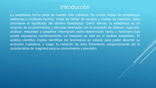 Este documento explica los diferentes niveles de medición en estadística, incluyendo medidas nominales, ordinales, de intervalo y de razón. Define cada nivel y proporciona ejemplos. También discute la importancia de las escalas de medición en la investigación científica y cómo la elección de la escala depende de la naturaleza de la variable que se está estudiando.