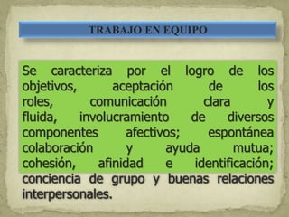 El documento describe las características del trabajo en equipo, incluyendo el logro de objetivos, roles aceptados, comunicación clara, involucramiento afectivo, colaboración y ayuda mutua, cohesión y buenas relaciones interpersonales. Explica que el trabajo en equipo se utiliza para realizar tareas complejas, generar ideas creativas, y coordinar funciones entre departamentos. Finalmente, proporciona una referencia bibliográfica sobre el tema.