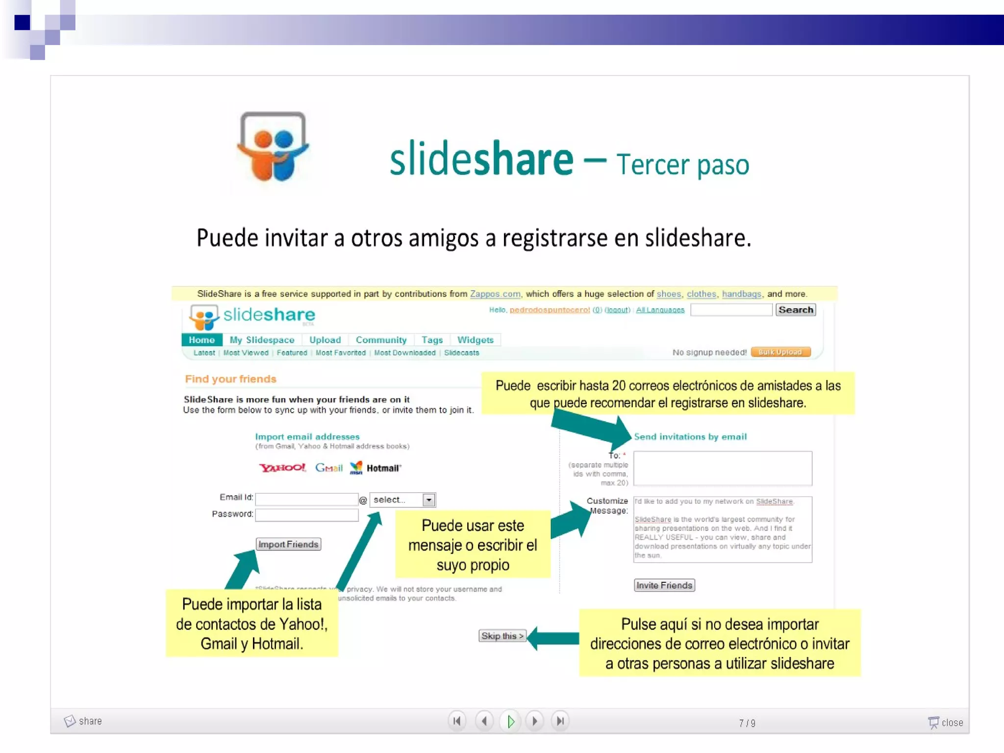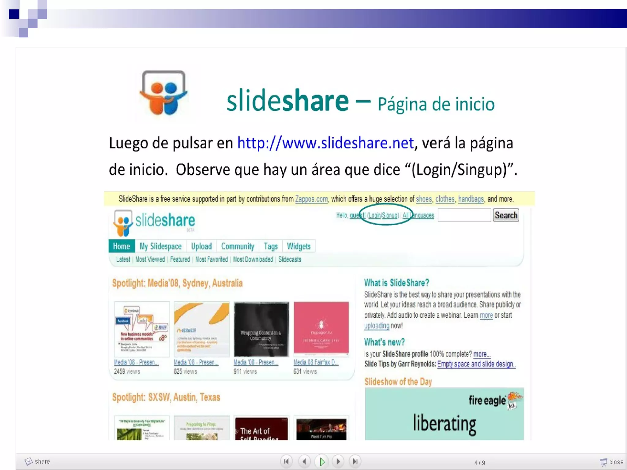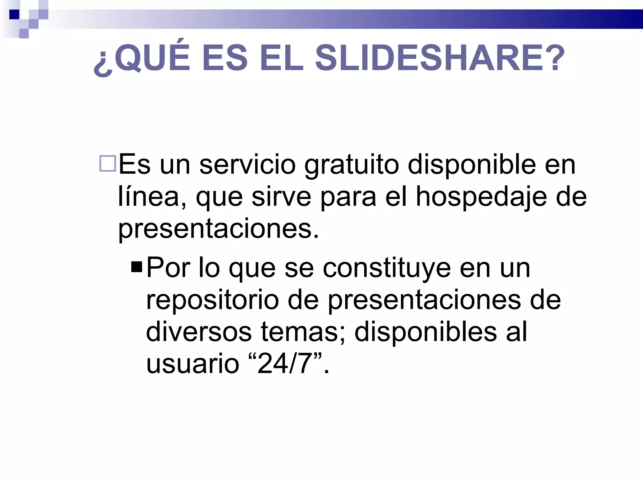Este documento describe Slideshare, un servicio gratuito en línea para alojar presentaciones. Permite compartir presentaciones de forma fácil sin necesidad de enviar archivos grandes por correo. Algunas ventajas son que se pueden ver las presentaciones desde cualquier computadora con acceso a Internet y compartir enlaces fácilmente. También permite clasificar presentaciones con etiquetas y agregar comentarios. Sin embargo, como formato, las presentaciones de PowerPoint son limitadas sin una explicación en vivo y no admiten animaciones. El documento explica el proceso de registro e cargar present