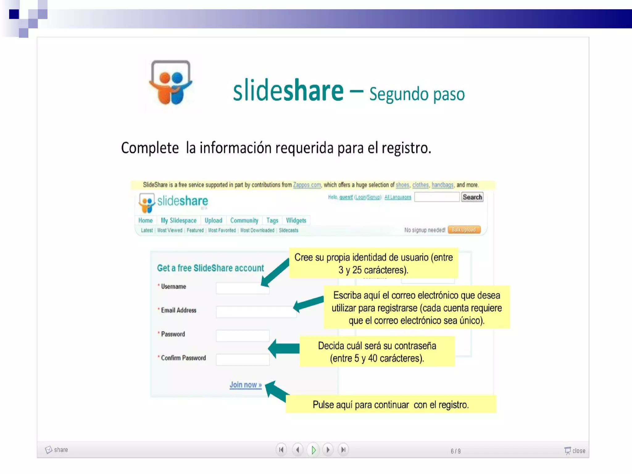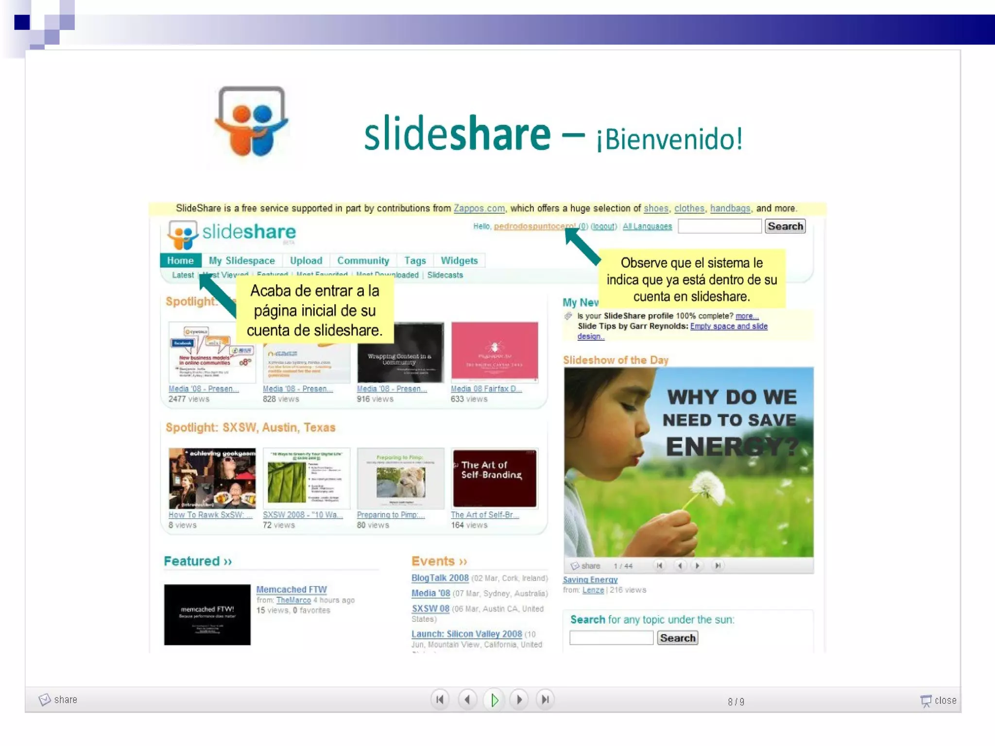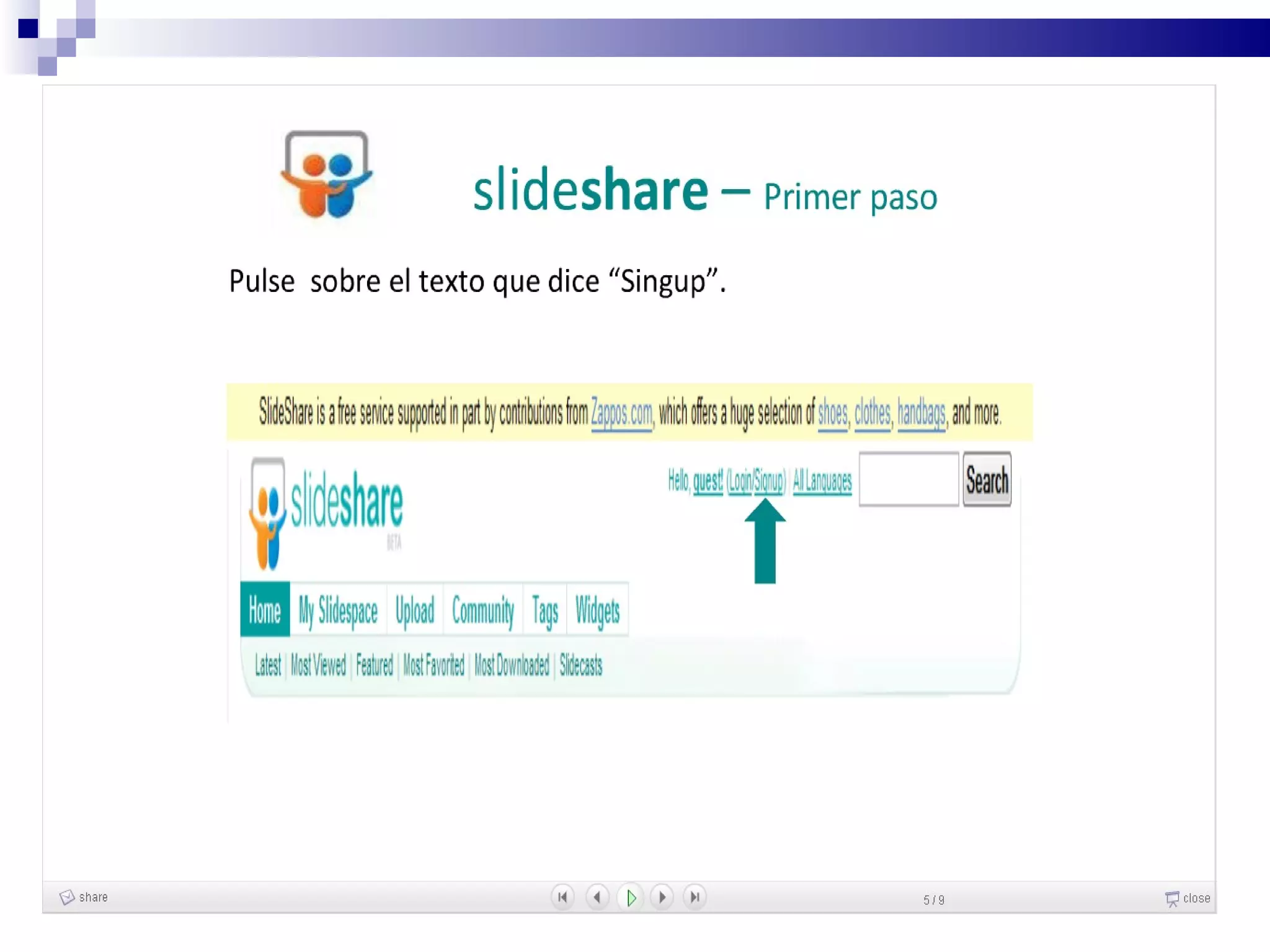 Este documento describe Slideshare, un servicio gratuito en línea para alojar presentaciones. Permite compartir presentaciones de forma fácil sin necesidad de enviar archivos grandes por correo. Algunas ventajas son que se pueden ver las presentaciones desde cualquier computadora con acceso a Internet y compartir enlaces fácilmente. También permite clasificar presentaciones con etiquetas y agregar comentarios. Sin embargo, como formato, las presentaciones de PowerPoint son limitadas sin una explicación en vivo y no admiten animaciones. El documento explica el proceso de registro e cargar present