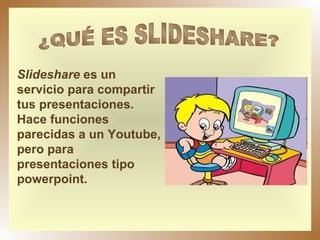 Slideshare es un servicio para compartir presentaciones como PowerPoint de forma similar a YouTube, permitiendo comentar, compartir y valorar las presentaciones de otros usuarios. Se puede usar en educación para que profesores y estudiantes creen y compartan material didáctico, así como para que los profesores creen redes de intercambio de información. En primer grado, Slideshare permite a los profesores crear presentaciones didácticas con gráficos, cuentos, canciones y colores para apoyar el aprendizaje de los niños de manera creativa e inter