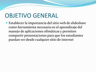 El documento describe la importancia del sitio web SlideShare como una herramienta para compartir presentaciones. Sus objetivos son establecer la importancia de SlideShare para el aprendizaje, analizar sus ventajas y desventajas, e interpretar y compartir información de manera sencilla. SlideShare permite a los usuarios subir y compartir presentaciones de manera privada o pública, y ofrece varios beneficios como la facilidad de participación y comunicación.