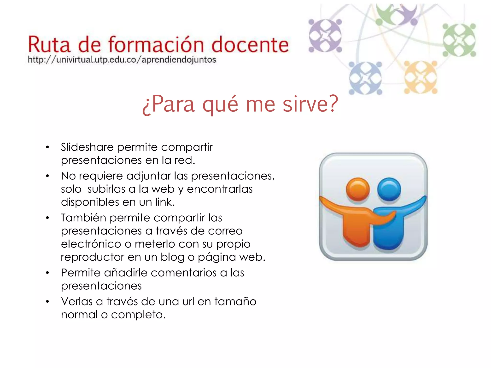 Slideshare es un sitio web que permite a los usuarios subir presentaciones en formato PowerPoint u OpenOffice para compartirlas en línea de forma gratuita. Los usuarios pueden publicar sus presentaciones en Slideshare en pocos pasos: crean una cuenta, cargan su presentación asignándole etiquetas y una descripción, y luego comparten el enlace o código embedido para que otros puedan verla.