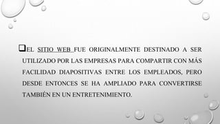 SlideShare es un sitio web que permite a los usuarios subir y compartir presentaciones de PowerPoint, documentos de Word, PDF y portafolios de manera pública o privada. Originalmente fue destinado a que las empresas compartieran diapositivas entre empleados, pero ahora también se usa para entretenimiento. Explica los pasos para crear una cuenta, subir una presentación, enlazarla en un sitio web o blog, y seleccionar presentaciones favoritas.